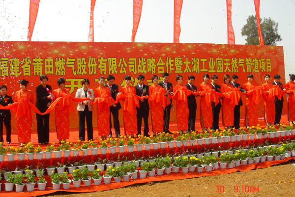 莆田燃?xì)夤居?/span>2010年4月30日在城廂區(qū)太湖工業(yè)園就天然氣管道項(xiàng)目舉行了隆重的開工儀式,剪彩的有城廂區(qū)五套班子、區(qū)委書記、區(qū)委副區(qū)長(zhǎng)、曠遠(yuǎn)集團(tuán)副總裁魏文喜等領(lǐng)導(dǎo)。目前太湖工業(yè)園區(qū)共招商10多家工業(yè)用戶,為我司后期提升燃?xì)怃N售增長(zhǎng)點(diǎn)提供了良好的開端。