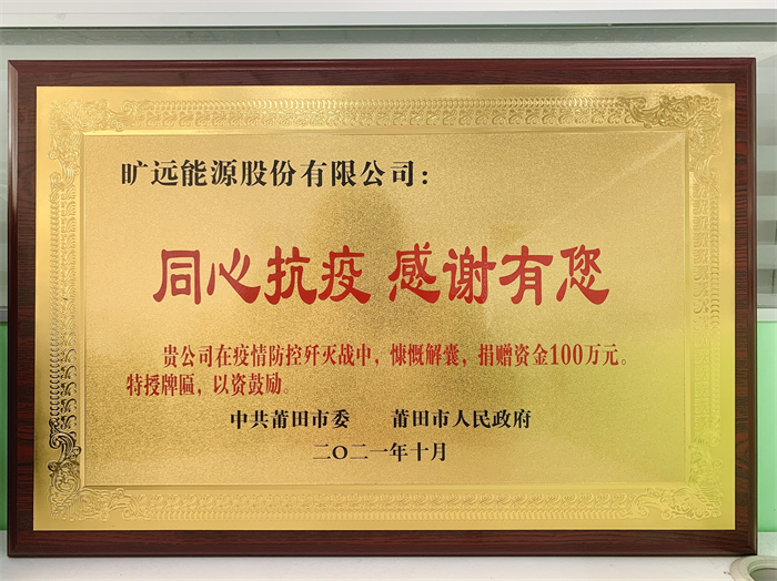 2021年12月16日上午莆田市紅十字會(huì)黨組書(shū)記、常務(wù)副會(huì)長(zhǎng)陳朝霞、黨組成員、四級(jí)調(diào)研員陳健暉一行專程赴曠遠(yuǎn)能源公司,感謝曠遠(yuǎn)能源在莆田市抗擊新冠肺炎疫情中的慷慨捐助和突出貢獻(xiàn),中共莆田市委、莆田市人民政府授予曠遠(yuǎn)能源【同心抗疫 感謝有您】榮譽(yù)獎(jiǎng)牌及愛(ài)心證書(shū),曠遠(yuǎn)能源財(cái)務(wù)總監(jiān)許義云代表公司接受獎(jiǎng)牌及證書(shū)。一份份捐款,傾注著同舟共濟(jì)的無(wú)價(jià)情誼;一筆筆款項(xiàng),凝聚著共克時(shí)艱的磅..